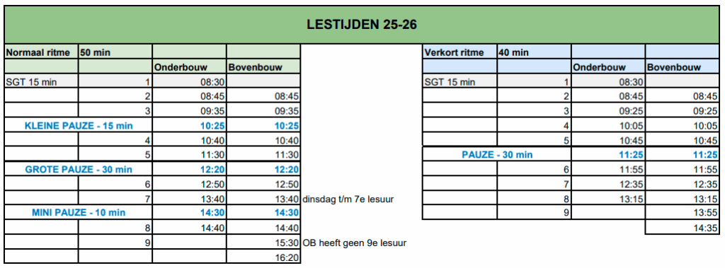 In de eerste tabel zie je hoe een normale schooldag eruitziet. Op dinsdagmiddag ben je uiterlijk na het 6e lesuur – om 13.35 uur – vrij. Op de andere dagen kun je tot 16.45 uur les hebben, afhankelijk van je ritme. Soms werken we met een verkort rooster (tweede tabel), zodat we ’s middags een activiteit kunnen plannen.
